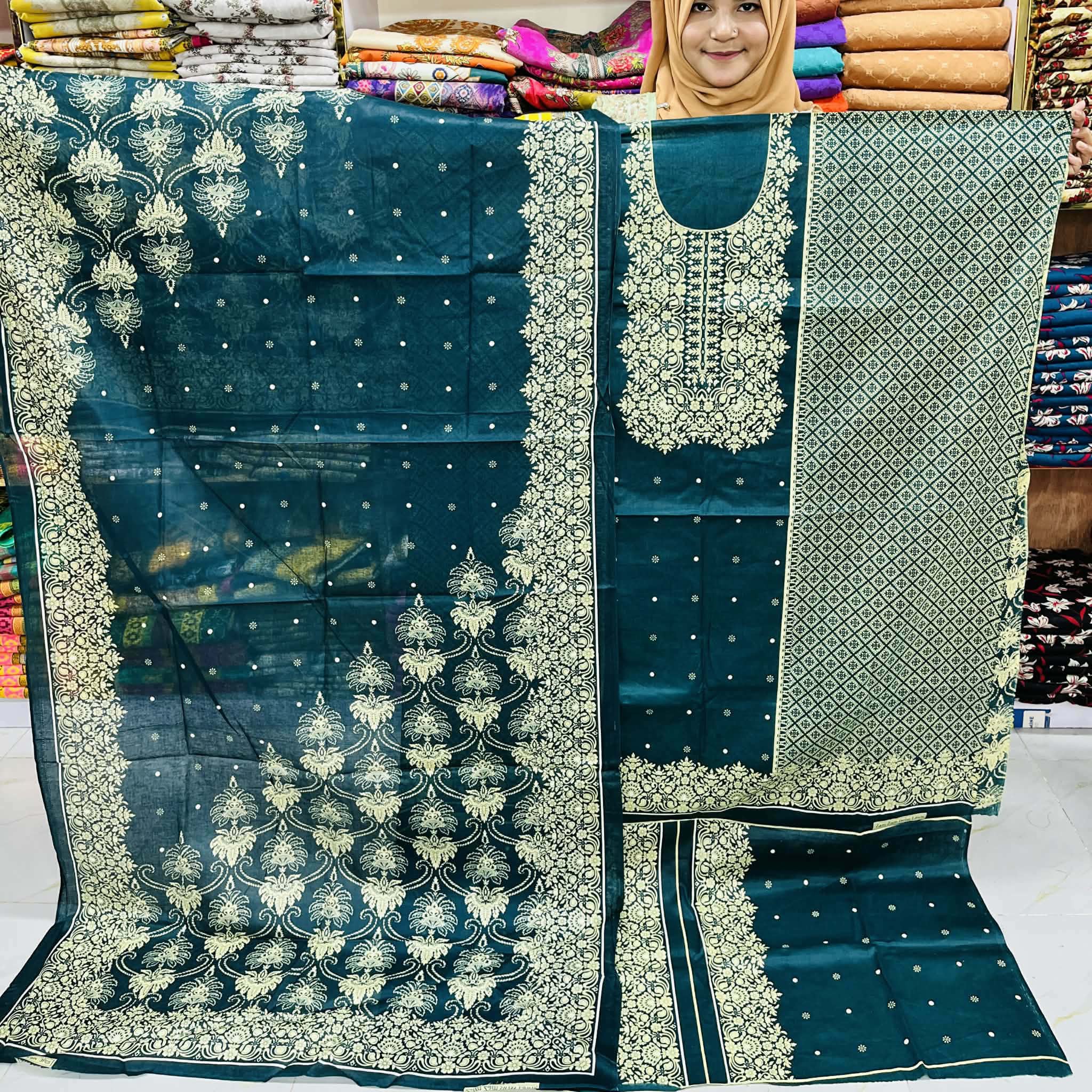 Trendy Kashmiri Cotton Three Piece – Unstitched Cotton Three Piece for Women